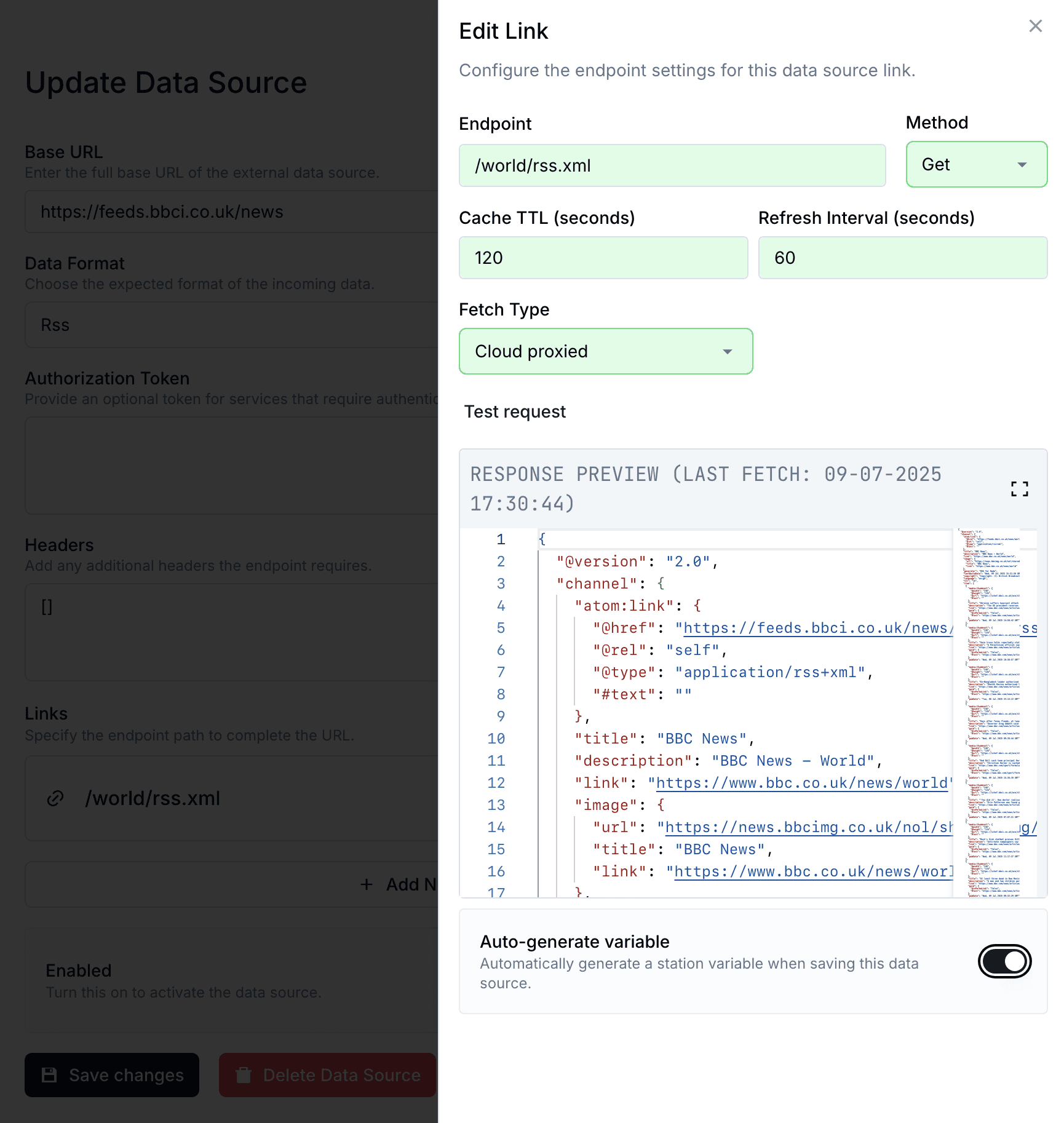 The easiest way to do this is by enabling the Auto-generate variable toggle. When you save the API Data Source, the system will automatically create a new variable with a descriptive name based on the feed.