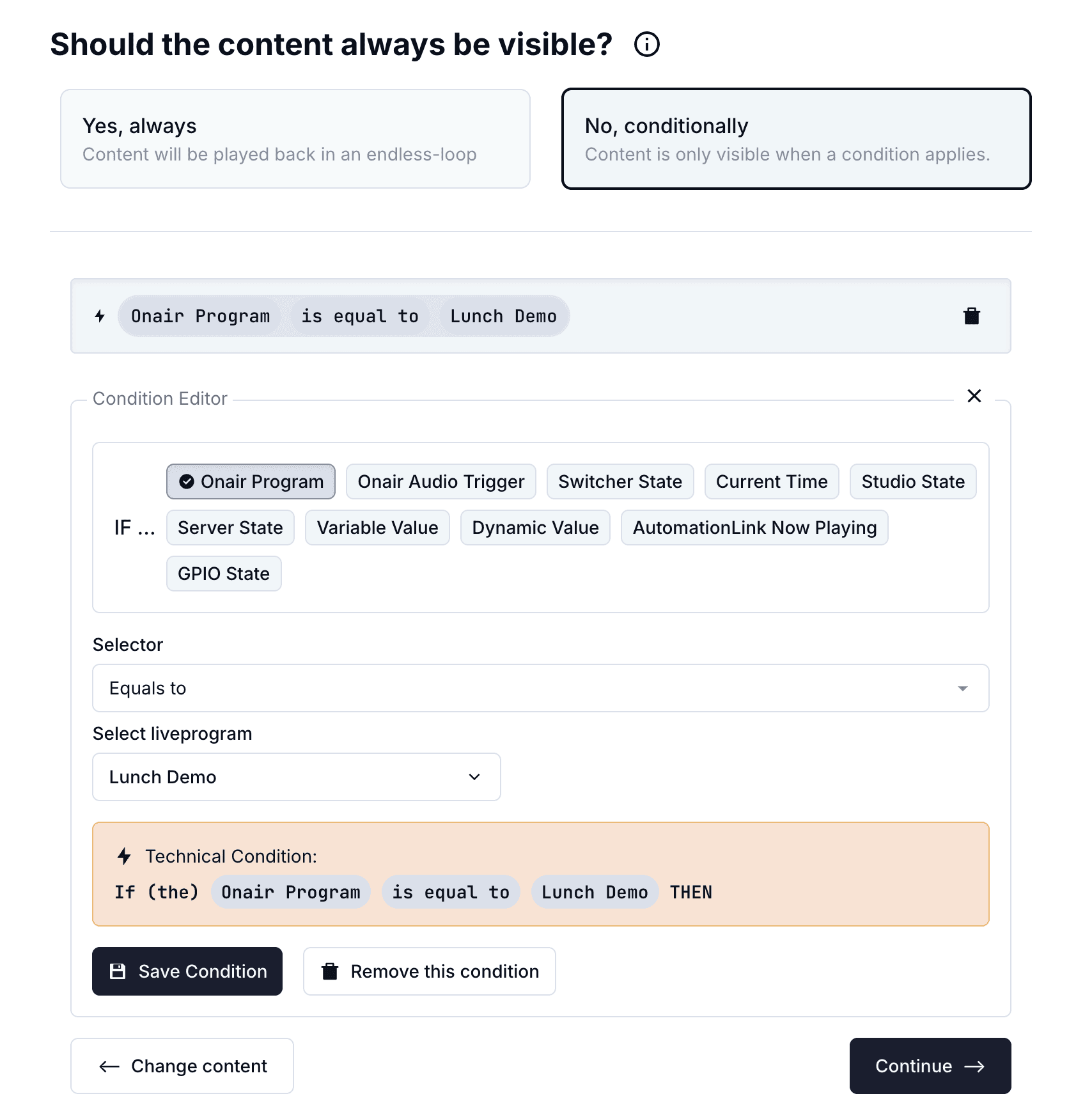 When the defined condition isn’t met, you can select a fallback option to be played back automatically. With the separate steps for configuration item you won't confuse fallbacks with the normal content of an Output.