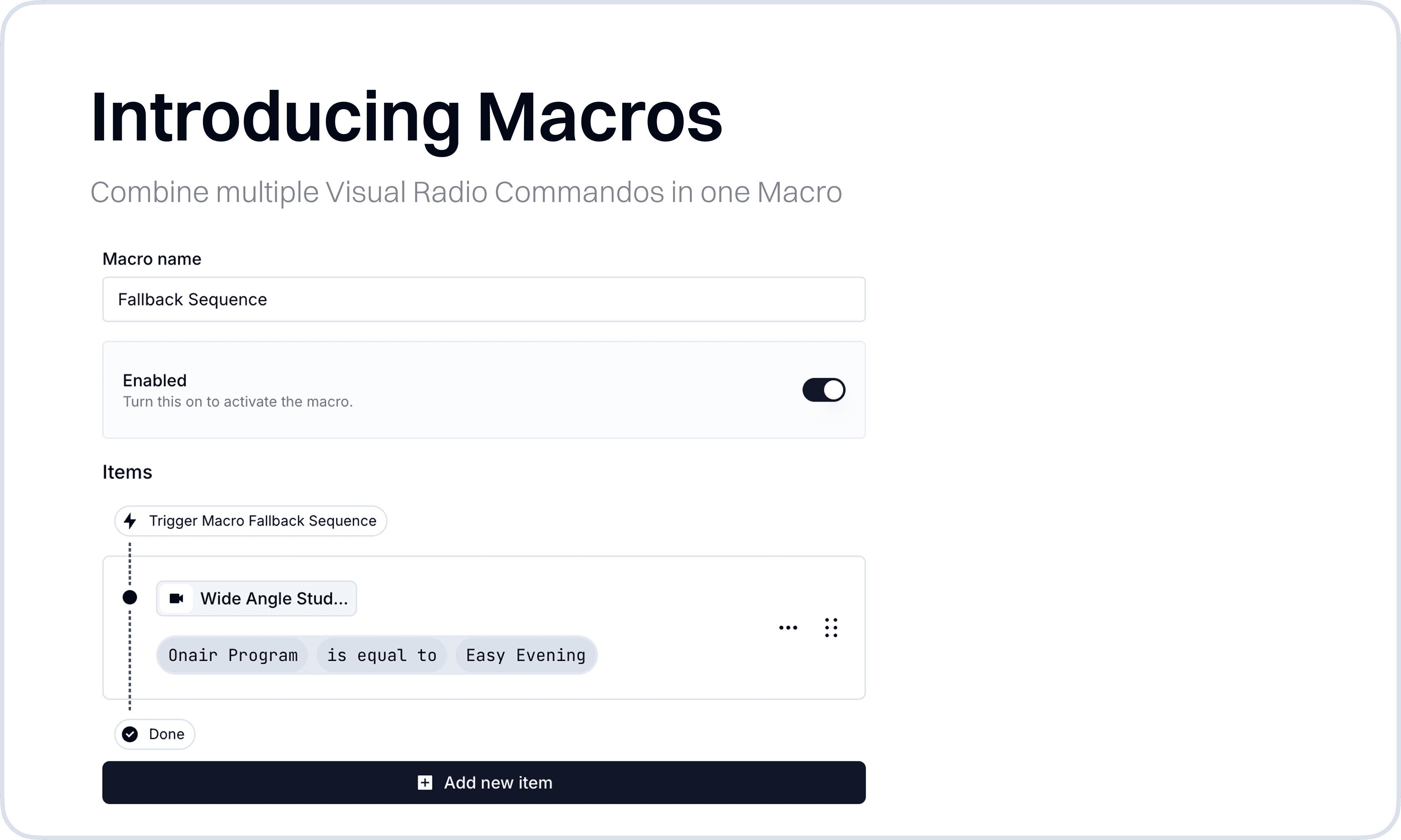 Running a live radio broadcast involves a lot of moving parts - switching camera angles, controlling PTZ presets, managing states, or adjusting what’s visible in your switcher setup. The new Macro feature in Visual Radio Assist helps you simplify this process by grouping multiple Commandos into a single, triggerable action.
